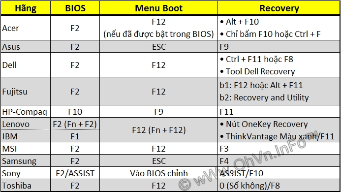 Hôm nay, mình chia sẻ đến cho các bạn tổng hợp phím tắt vào Bios, Menu boot, Recovery cho tất cả các hãng Laptop Acer, Asus, Dell, Sony, Fujitsu, HP, Lenovo, MSI, Samsung, Toshiba… chắc hẳn sẽ giúp ích rất nhiều cho các bạn đó.
