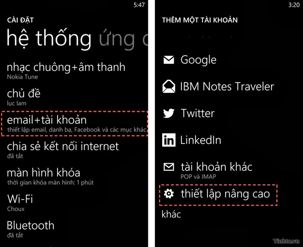 Sau khi đã gỡ sạch sẽ các tài khoản Gmail hiện có, danh bạ và lịch của bạn nếu có đồng bộ từ Google xuống máy Windows Phone cũng sẽ biến mất. Đừng lo lắng, chúng ta sẽ thêm lại sau. Bây giờ thì tiếp tục nhấn vào nút “thêm tài khoản” (cũng trong giao diện Cài đặt > email + tài khoản). Kéo xuống dưới cùng của màn hình, chọn “thiết lập nâng cao“.