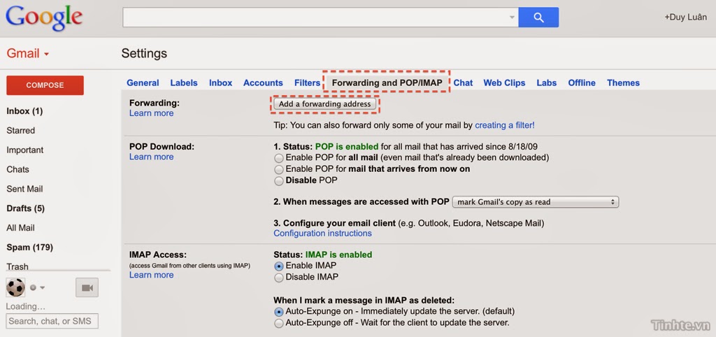 2. Chọn tiếp thẻ “Forwarding and POP/IMAP”, nhấn nút “Add a forwarding addrees”. Nhập địa chỉ email Outlook.com của bạn vào đây (nó cũng chính là tài khoản Microsoft mà bạn xài để đăng nhập vô máy Windows Phone, hoặc Hotmail hay Live Mail nếu trước đây bạn có xài). Nhấn tiếp nút “Next” và “Proceed”.