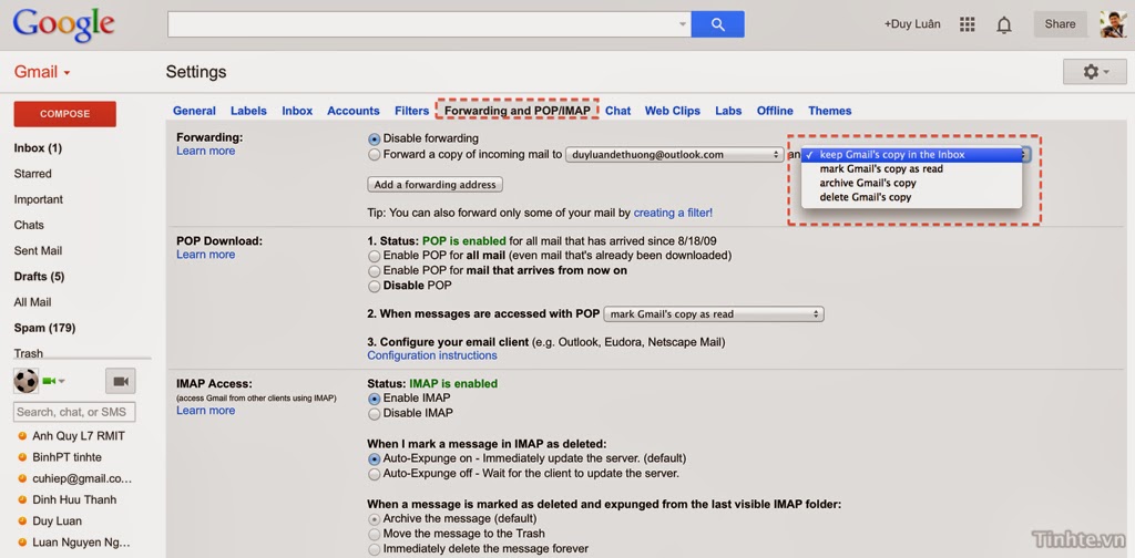 5. Nếu thích, bạn cũng có thể đăng nhập thêm tài khoản Google lên máy Windows Phone để gửi thư bằng địa chỉ này, nhưng nhược điểm đó là bạn sẽ bị trùng email (một thư từ Google, thêm một thư nữa do Google chuyển tiếp qua Outlook.com). Nếu cảm thấy khó chịu vì chuyện này, bạn hãy truy cập lại vào Gmail.com, cũng vào thẻ Forwarding and POP/IMAP như khi nãy. Ngay dòng “Forward a copy to…“, bạn có thể chọn một số thao tác: