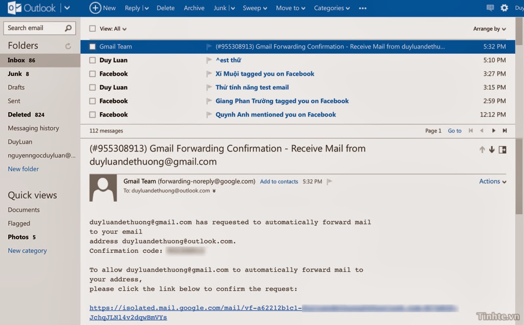 3. Truy cập vào trang web Outlook.com, bạn sẽ thấy Google mới gửi cho bạn một email chứa mã xác nhận. Trong thư sẽ có một đường link, nhấn vào đó để kích hoạt việc chuyển tiếp.
